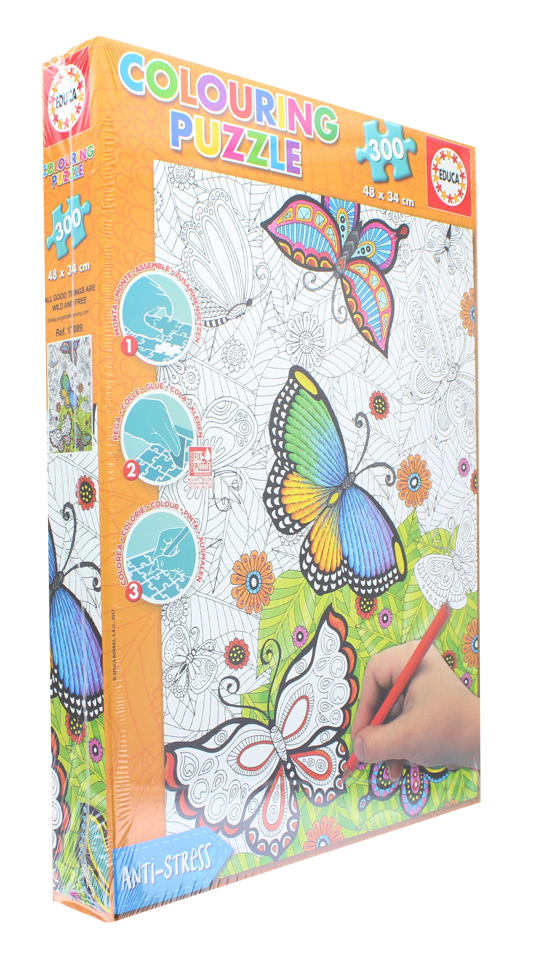 Unwind with Educa’s new coloring puzzle series. First you assemble the 300-piece puzzle, next set the pieces in place permanently with the included PuzzleFix glue, and finally personalize it with your choice of colors (not included)! Use colored pencils, crayons, markers, watercolors, etc. to make it one of a kind! Approximate size of the assembled puzzle: 18 3/4" x 13 1/2".