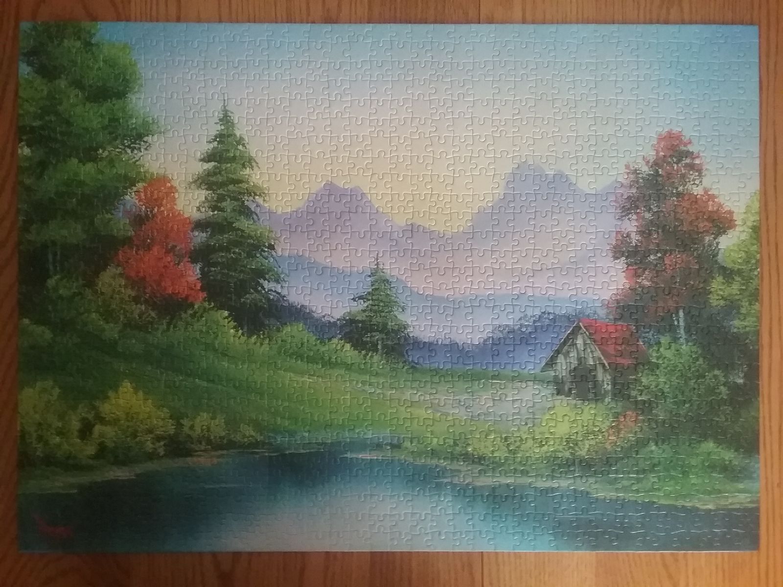 - Creative Design: Inspired by legendary artist Bob Ross, the puzzle image features a quiet getaway in the countryside. Capturing the signature style of Bob Ross, the scenic landscape design shows a small cabin on the lake and far-off mountains.