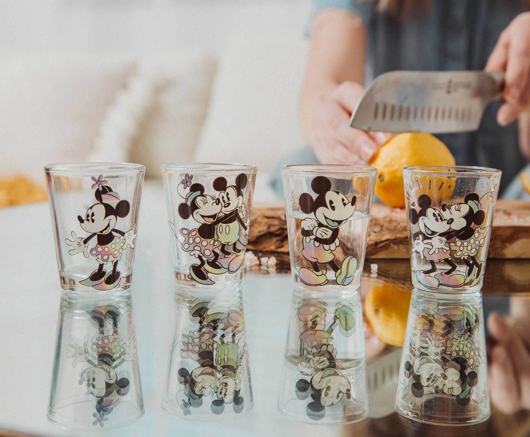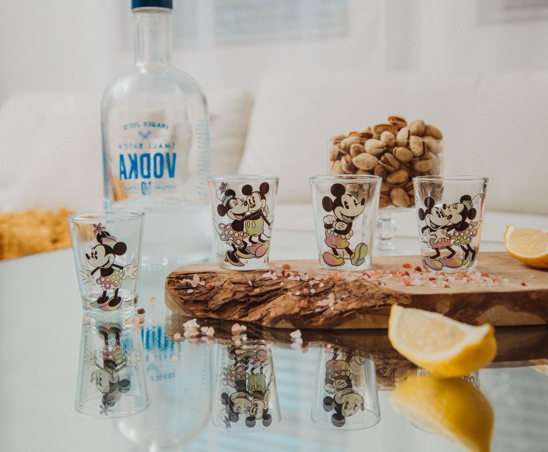 - A COUPLE OF SWEETHEARTS: Bring some Disney romance into your nights with these exclusive mini shot glasses that're colored with love. Always close to your heart, Mickey and Minnie are looking radiant on this charming glassware set.