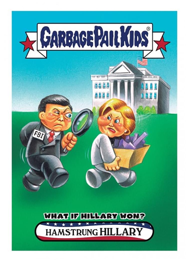 Topps is celebrating the race to the white house with "Garbage Pail Kids: Disg-Race to the White House" on-demand stickers! What If Hillary Won #68 Hamstrung Hillary. Print run of only 401 stickers. Stick it wherever you'd like to show some political party support—or lack thereof!