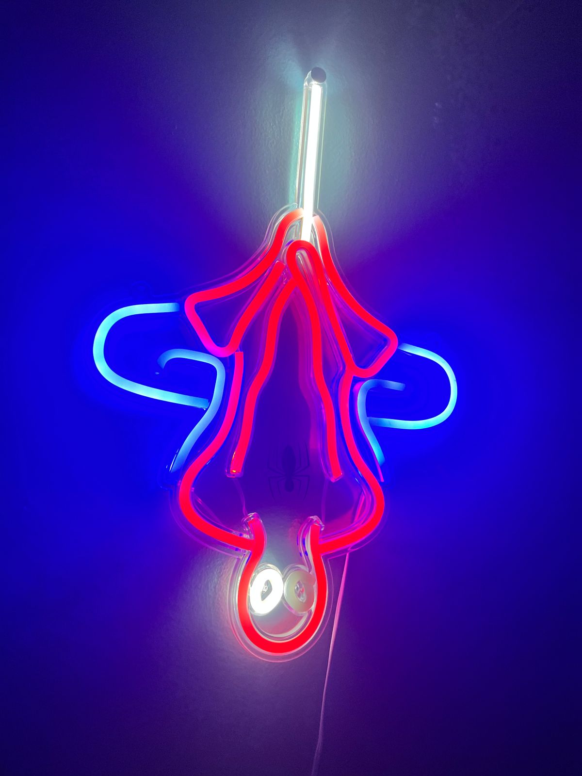 - MARVEL-OUS STYLE FOR HOME: Spidey hangs in his iconic upside-down pose, featured here in an old-school neon look created with long-lasting LED bulbs. Glows a bright blue to cast away baddies lurking in the shadows.